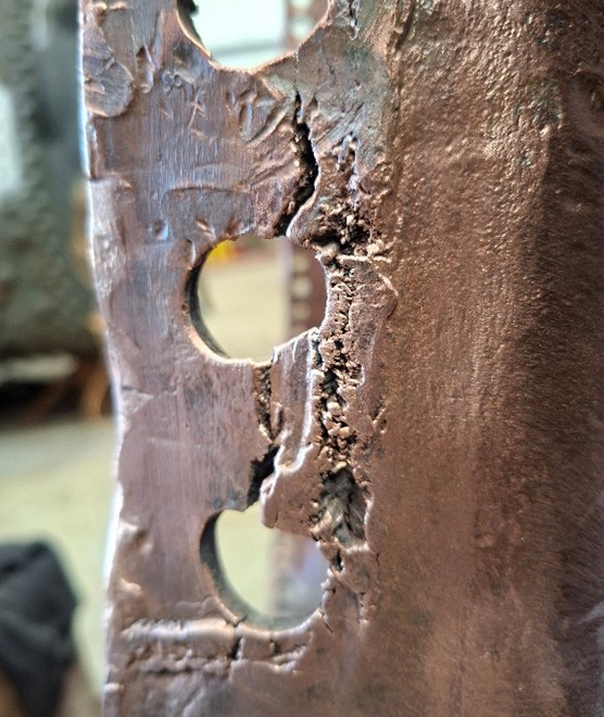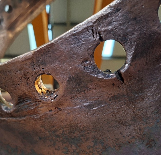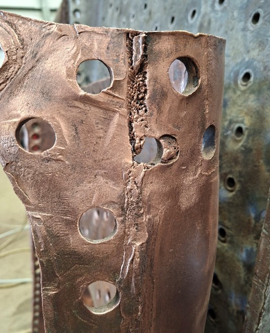 Despite our best efforts the overhaul of our boiler is proving to be a challenge, with increasingly more additional work being discovered as the boiler is dismantled. We had already reported the need to replace the lower sections of the sides of the copper firebox due to extensive star cracking around most of the stay holes in the copper. We were also aware that the previous repairs to the laps in the copper Doorplate were a cause for concern. It was agreed with the boiler inspector that the copper Doorplate should be removed to enable us to examine the quality of the previous repairs done at Eastleigh in 1964. There were also a few localised areas around the Firehole door that needed to be built up with copper weld. Leaky Finders decided to carry out the weld repairs around the Firehole door before removing the Doorplate as the surrounding stays and rivets would ensure the copper did not distort during the welding process when the localised heat from the welding can cause the copper to deform if not held firmly in place. Soon after welding was started, Leaky Finders contacted me to say that what looked like blow holes were appearing in the copper plate around the door ring rivet holes. Having never seen this issue before, it was agreed that welding work should be paused and the copper Doorplate removed to see exactly what was going on.